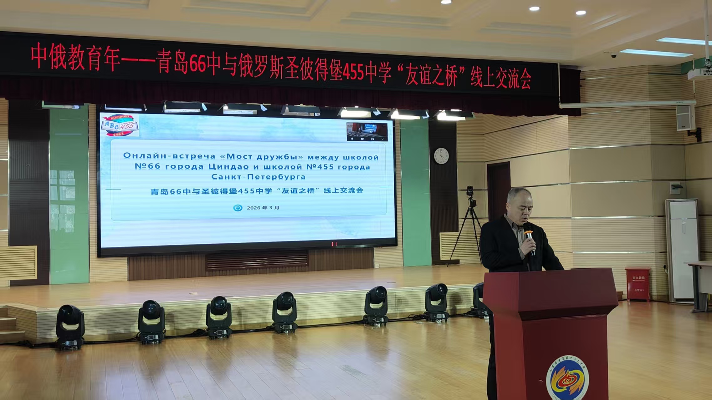 青岛六十六中党委副书记、副校长王光鹏在致辞中,深情回顾了两校友谊的发展历程。他表示,自2018年穆德拉克主席为两校牵线搭桥,2019年两校正式建立友好学校关系、俄方师生代表团来青岛参加“游学青岛”夏令营活动以来,这份跨越万里的友谊在双方的共同呵护下不断深化。受疫情影响,后续两校交流转为线上常态化开展,从积极参加对方外语艺术节、节日互送祝福视频与问候信件,到青岛六十六中2025年建校百年之际,圣彼得堡455中学专门发来贺信、祝福视频并寄来精美纪念礼物,每一份互动都成为两校友谊最珍贵的见证。更令人动容的是,中国驻圣彼得堡总领事罗占辉先生也为学校校庆送上祝贺卡片,这也从另一个层面彰显了两校教育、两市文化交流对两国人文交流、友谊发展的深层价值和意义。