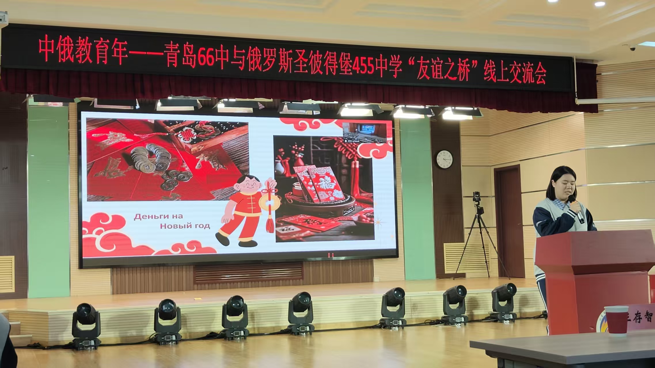 活动伊始,圣彼得堡国际交流协会主席玛格丽塔·穆德拉克率先致辞,她高度肯定了两校多年来的友好合作成果,寄语两国青少年以文化为纽带,深化友谊、互学互鉴,为中俄两国友好关系的长远发展注入青春力量。值得一提的是,正是穆德拉克主席在2018年访问青岛、参加国际友城教育交流会时,为两校牵线搭桥,介绍了圣彼得堡455中学,为这份跨越万里的友谊播下了种子。随后,圣彼得堡455中学校长柳博芙·吉米娜通过俄语致辞,回顾了两校合作历程,介绍了该校在传播中国文化、开展中俄文化交流方面的具体举措,表达了进一步深化两校合作的热切期盼。俄方还通过视频展示了圣彼得堡当地庆祝中国新年的场景、该校“中国新年”校园文化节的精彩瞬间,以及校园生活片段,其中不仅有充满烟火气的节日氛围,更有春节习俗、中国美食精彩亮相,生动展现了俄罗斯师生对中国文化的喜爱与认同。
