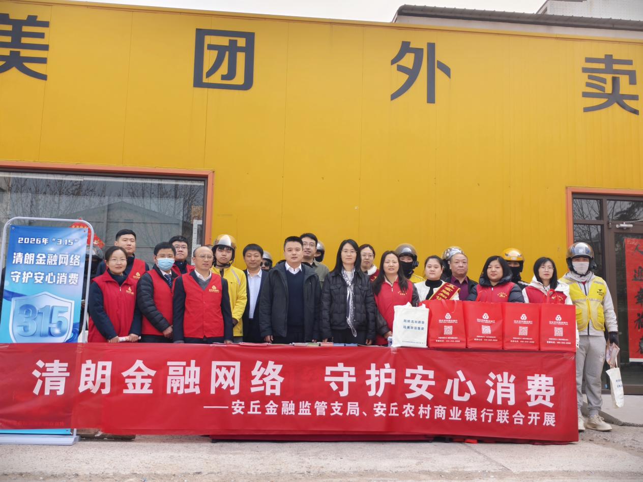 前不久,安丘农商银行携手安丘金融监管支局,走进美团外卖安丘总部,开展“清朗金融网络 守护安心消费”主题宣传活动,将金融消保知识精准送达外卖骑手身边,用心守护新就业形态劳动者的金融安全。