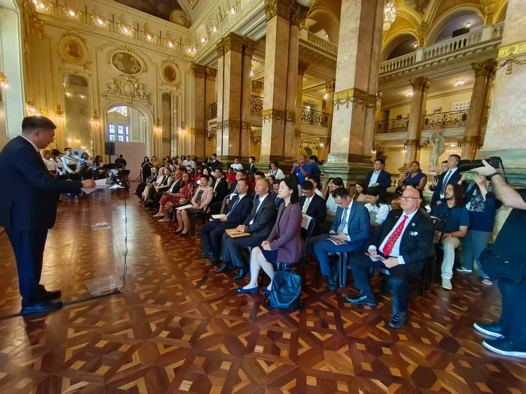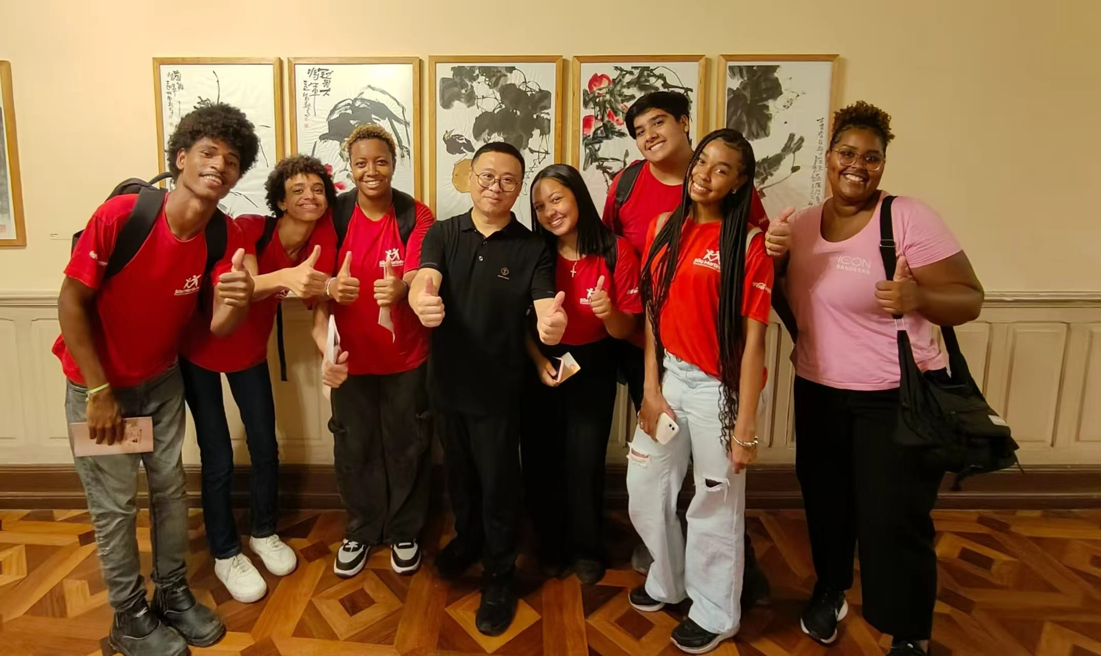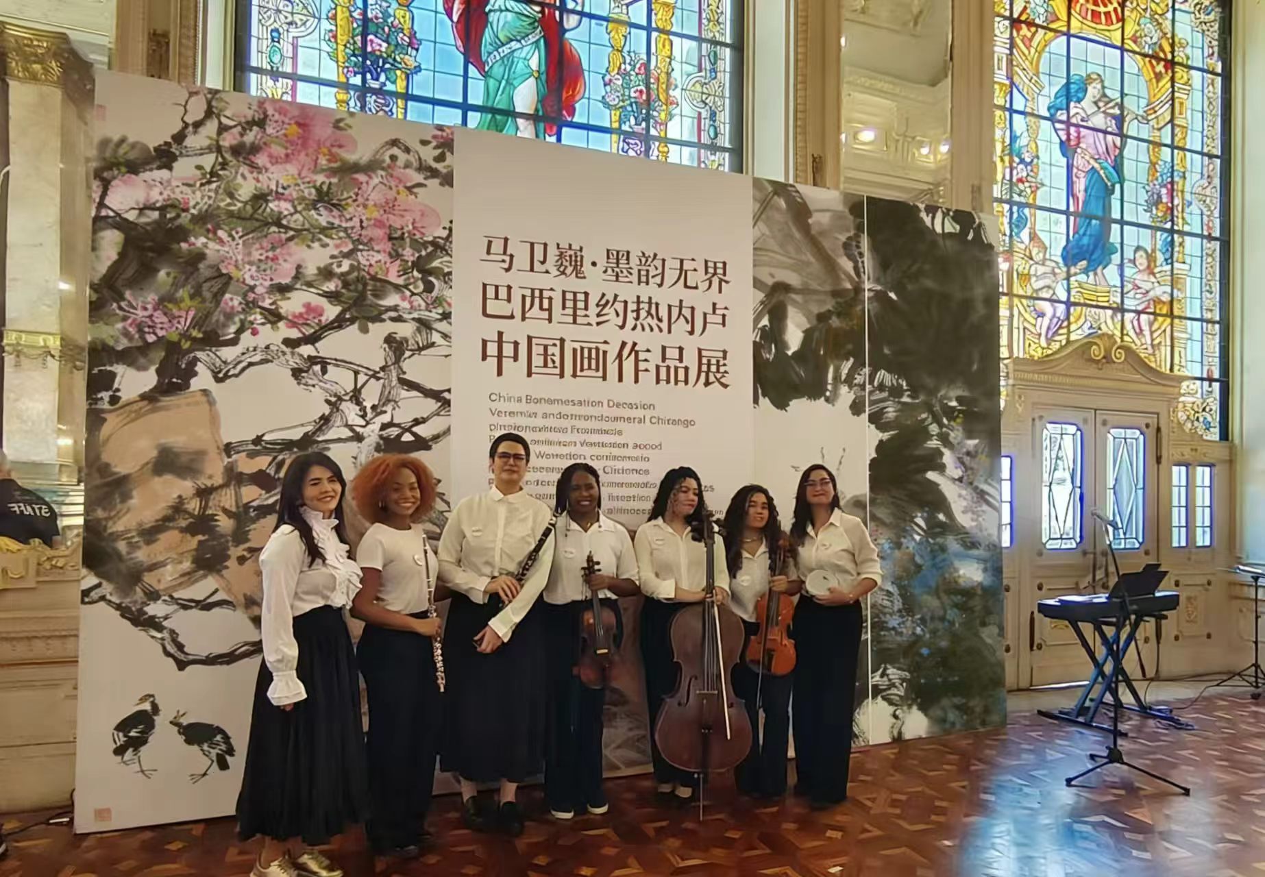 画家、作家、文化学者马卫巍正向在场嘉宾逐一介绍参展的六十幅水墨作品,他指着一幅寿桃和水墨鱼说:“中国传统水墨恰恰能体现东方含蓄内敛美,寿桃寓意健康长寿,寄托着中巴友谊源远流长的美好祝愿;而鱼的灵感源自里约这座海滨城市,将东方美学和巴西地理文化巧妙融合。”