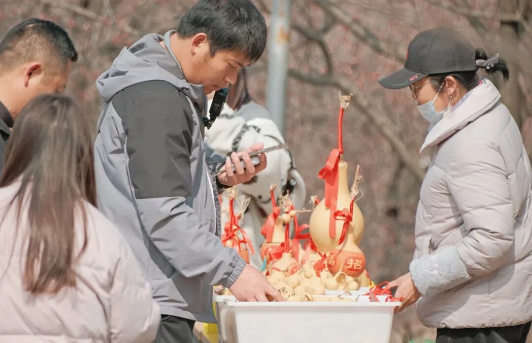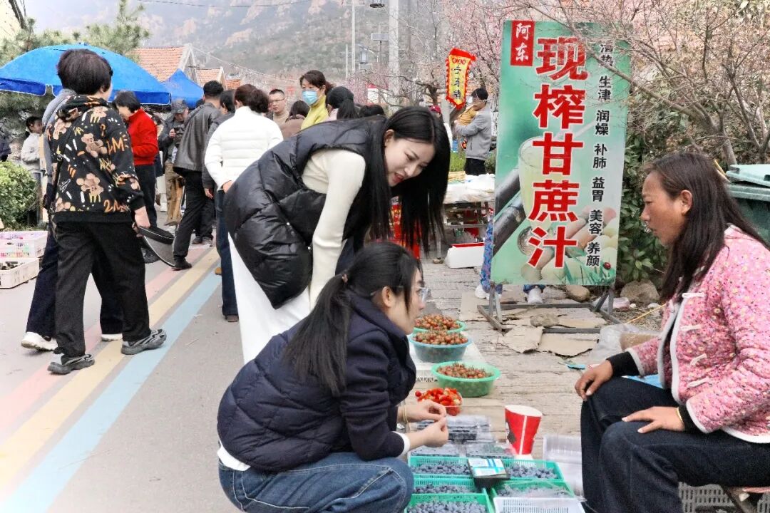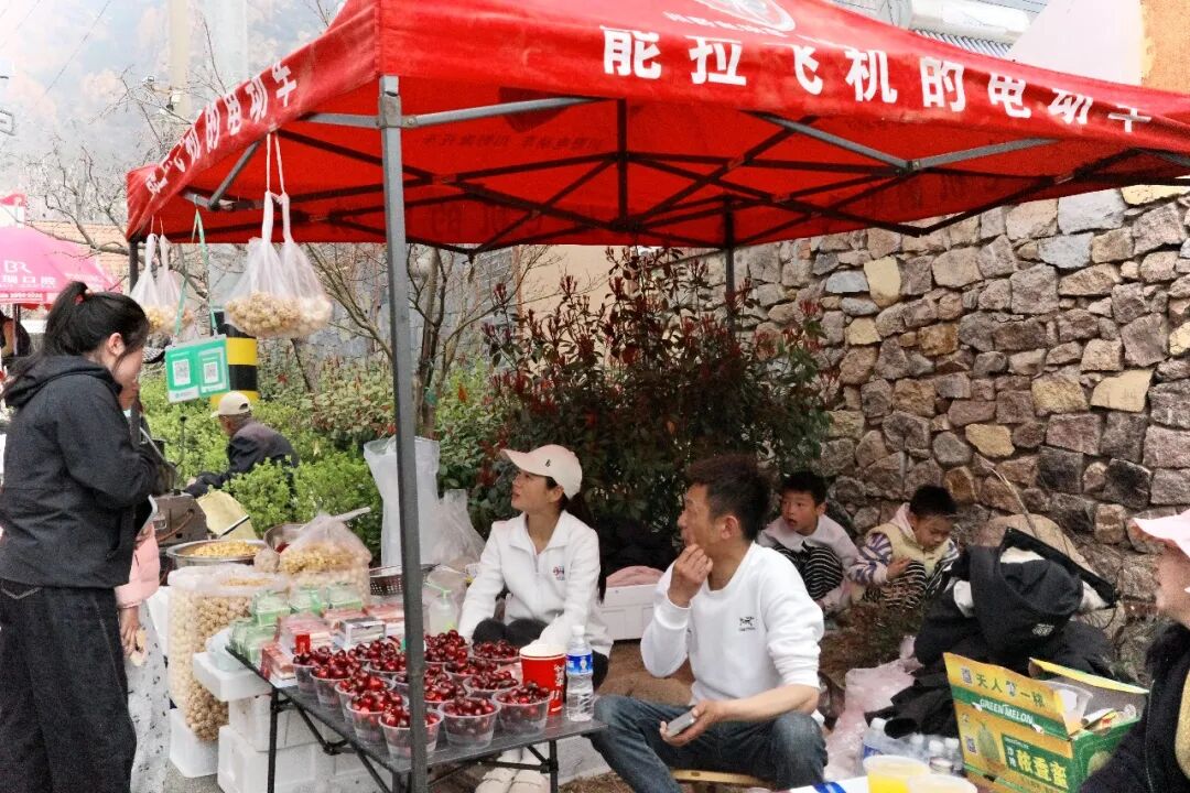 田间农产香,市集聚人潮。在漫山樱桃花海中,山路长径、花海周边的农产市集成为一道别样风景。村民孙大姐守着摊位,脸上始终挂着笑意:“花开了,游客就多了,自家种的大棚樱桃、小米和蔬菜,往这儿一摆,没多久就卖光了。”在大旺村,本地农户纷纷把自家的农特产品、手工制品搬到花海旁,不用远行、不用吆喝,便借着赏花的人气打开了销路。