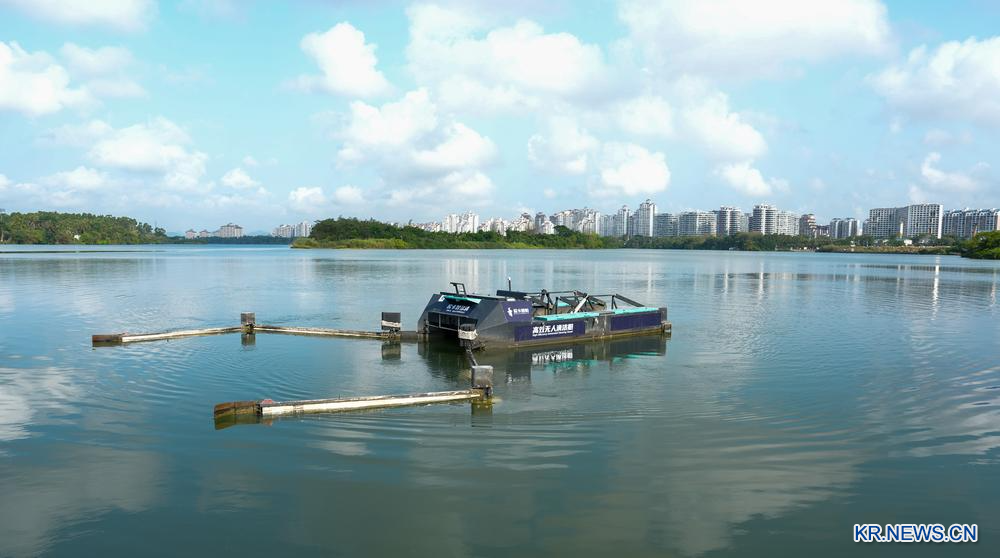 25일 충하이시 완취안허(萬泉河) 수면에서 수상 스마트 환경위생 무인 청소선이 작업을 하고 있다. 2026.3.25