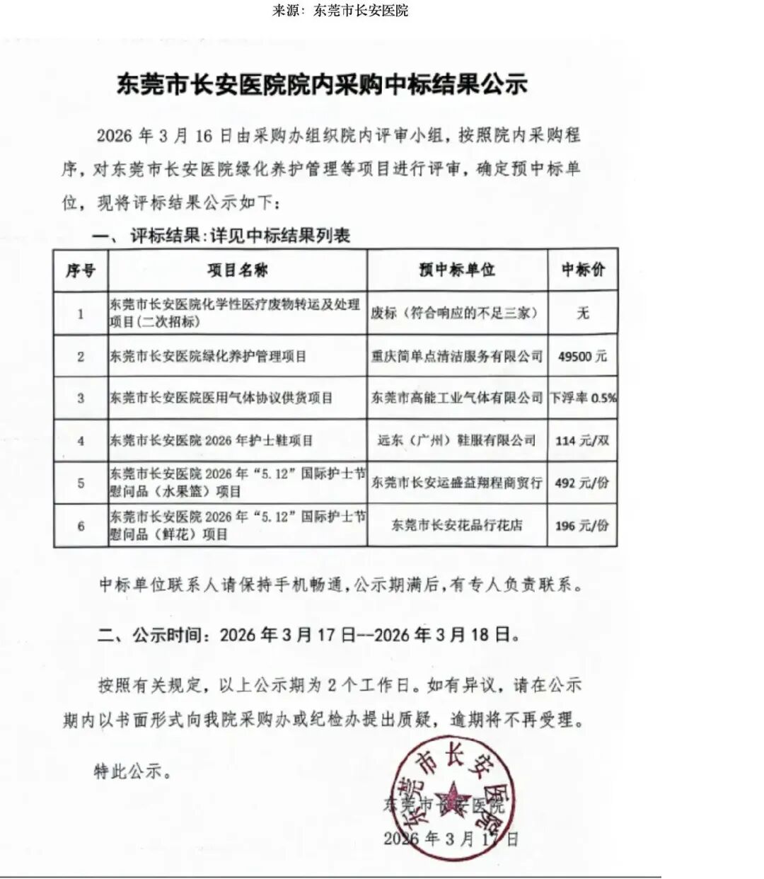 其中,第5项为东莞市长安医院2026年“5.12”国际护士节慰问品(水果篮)项目,中标价格为492元/份,预中标单位为东莞市长安运盛益翔程商贸行,公示的时间为3月17日至3月18日。