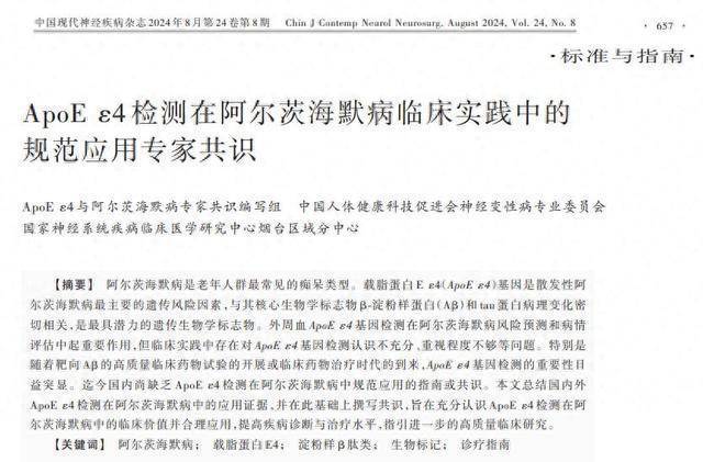 第一项共识为《ApoEε4检测在阿尔茨海默病中的规范应用专家共识》。ApoEε4是散发性阿尔茨海默病最主要遗传风险因素与核心生物标志物,此前临床应用不足、解读不规范。巴茂文教授团队牵头明确检测适用人群、结果解读与高风险人群干预路径,推动阿尔茨海默病防控从“经验判断”迈向基因指导的精准防控。