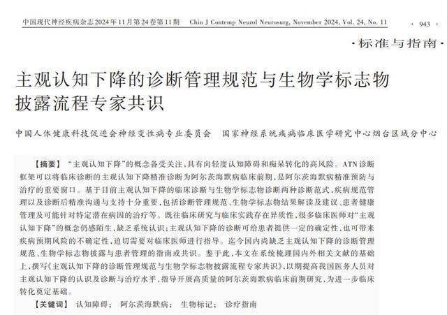 第二项共识为《主观认知下降的诊断管理规范与生物学标志物披露流程专家共识》。“主观认知下降”是患者自觉认知减退、但客观检查未达异常的状态,是阿尔茨海默病临床前期与最佳干预窗口期,却常被忽视。