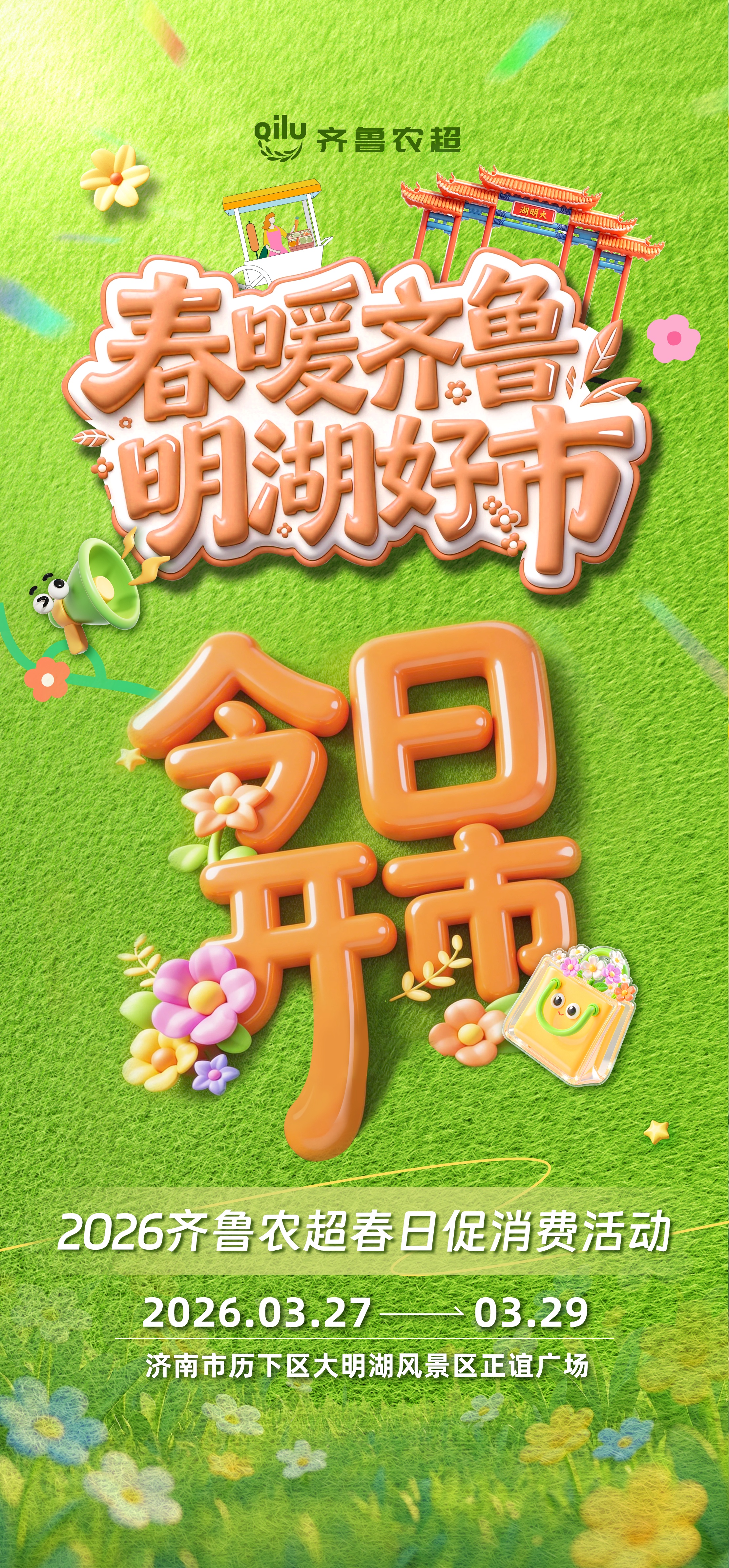 仲春时节,花朝如约。3月27日,“春暖齐鲁 明湖好市”2026齐鲁农超春日促消费活动在大明湖风景区正谊广场正式开市。本次活动汇聚山东各地数百款特色产品,涵盖生鲜果蔬、熟食卤味、滋补茶饮、非遗手造等多个品类,一站式满足市民游客逛吃购玩的全方位需求,让大家在赏明湖春色的同时,尽享齐鲁大地的烟火风味与文化底蕴。