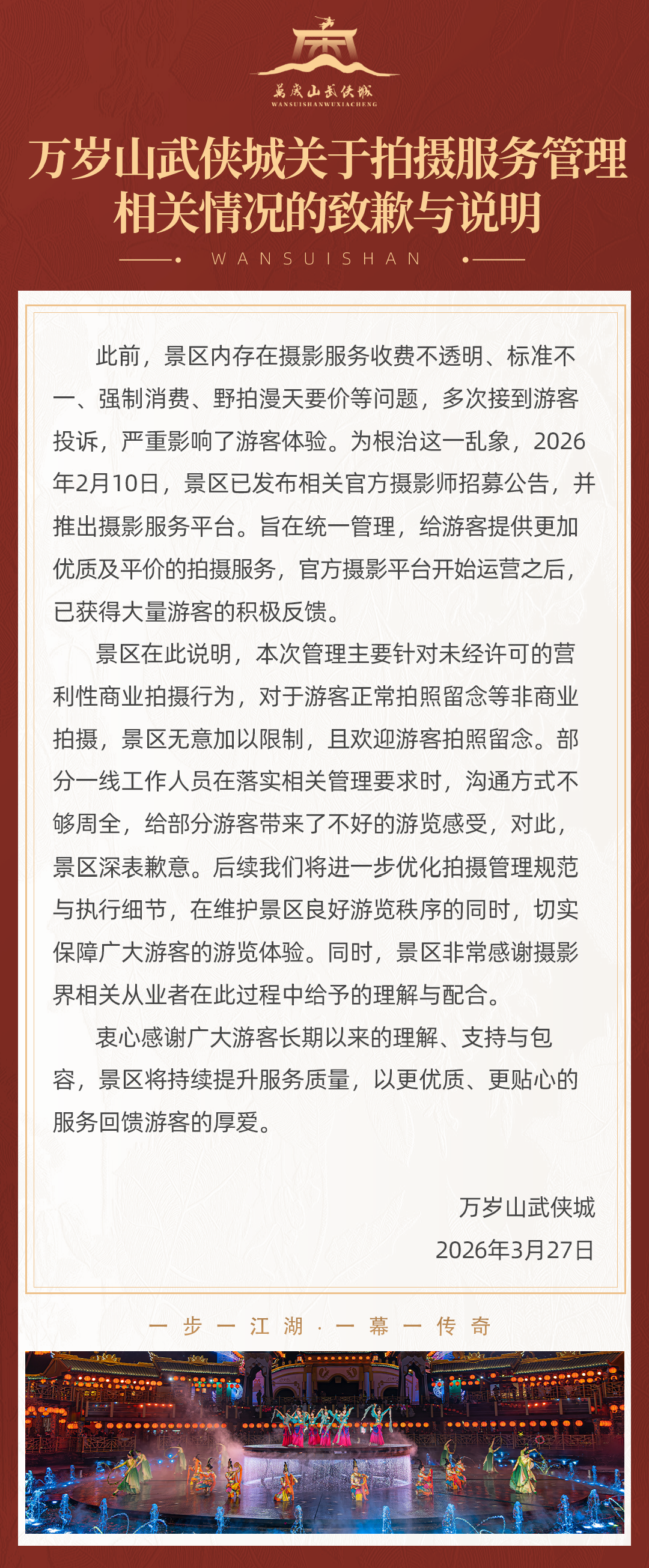 3月27日,万岁山武侠城发布《关于拍摄服务管理相关情况的致歉与说明》: