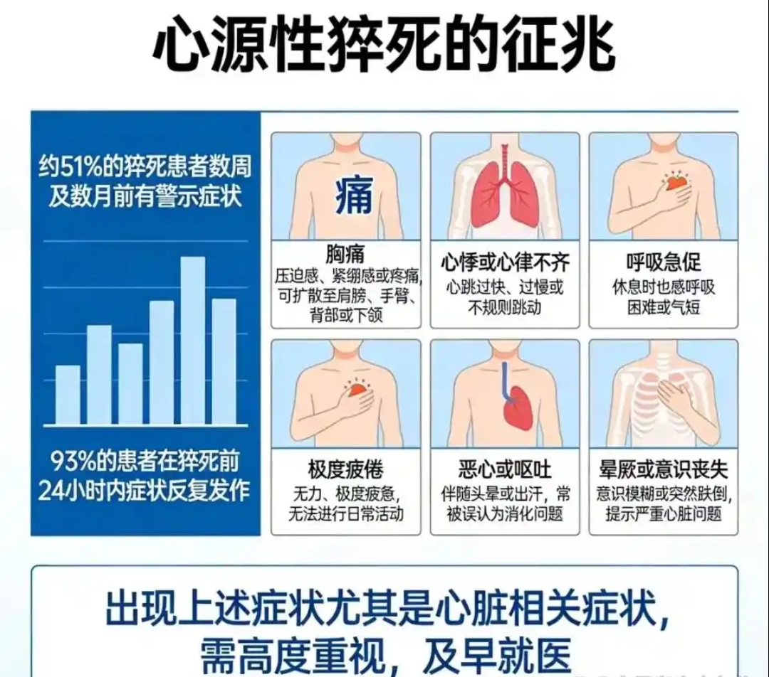 心源性猝死发病急、死亡率高,但并非毫无征兆。周诚怿大夫强调,很多患者在发病前,都出现过易被误判的小症状,常被简单当成“过度劳累”而忽略。