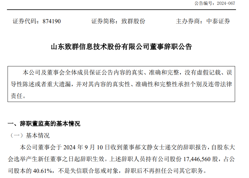 经济导报记者注意到,不到一年半的时间里,致群股份接连出现董事、监事、核心业务高管的辞任,且均以“个人原因”作为统一披露事由。2024年9月11日,致群股份发布的董事辞职公告显示,郝文静因个人原因辞去董事职务,辞职后不再担任公司其他职务。