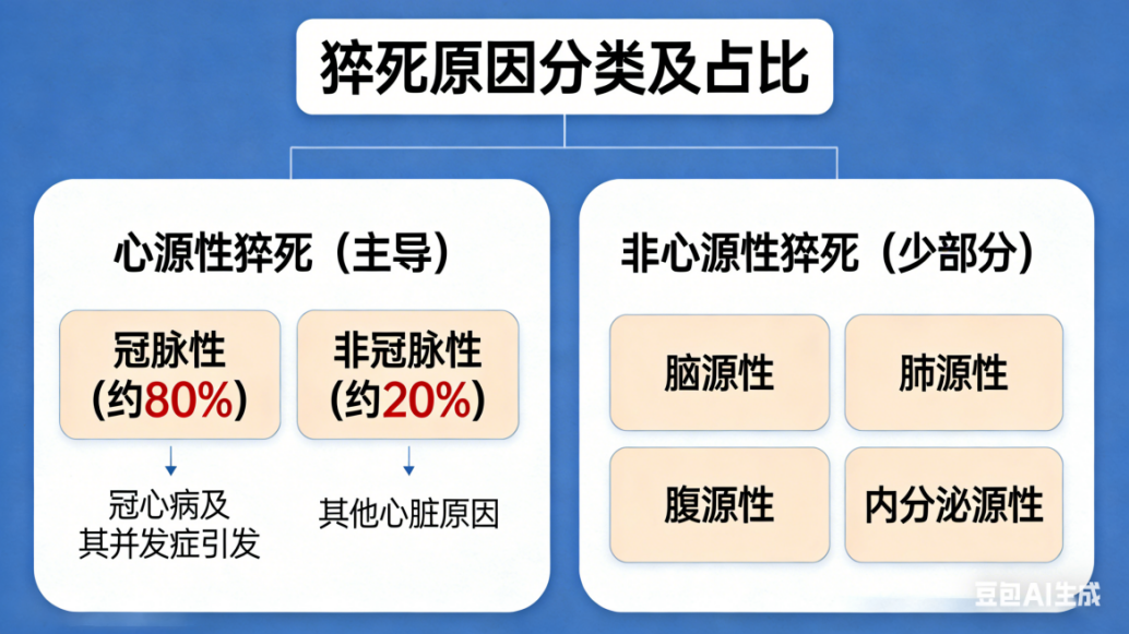 猝死的原因并非单一,主要分为心源性和非心源性两大类,其中心源性因素占主导地位,少部分由脑源性、肺源性、腹源性及内分泌源性等其他原因引起。