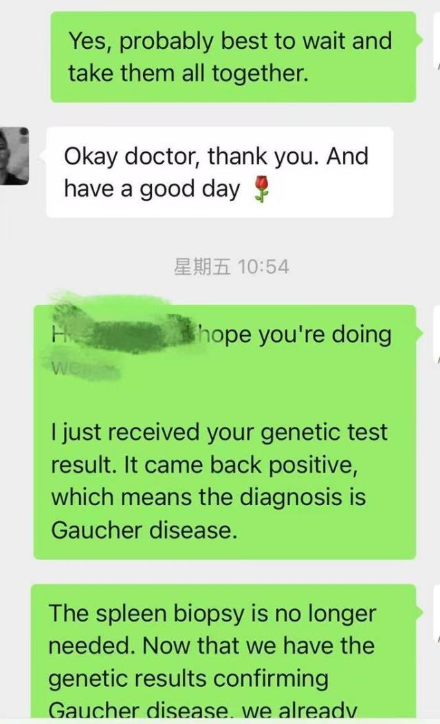 第15天,检测结果阳性,确诊戈谢病。林蕾蕾博士第一时间将喜讯与希望告知患者:“结果出来了,是戈谢病。这个病现在有药,国内有国产药,而且已经进医保了,接下来我们一起想办法。”等待的日子里,林蕾蕾医生一直通过微信和马安保持联系。他从不催,每次都说“理解”“没关系”“您辛苦了”。