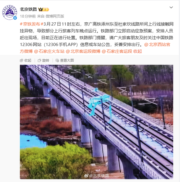 北京铁路通报京广高铁部分列车晚点:线路所间上行线接触网挂异物,已启动应急预案