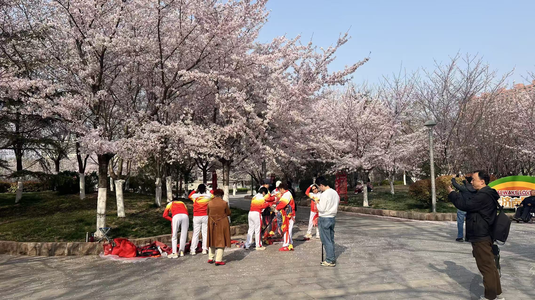 初春时节,位于大明湖北门斜对面的济南市第一个樱花主题城市广场“天桥滨湖广场”上,3个品种500余株樱花竞相开放,花瓣在春风中优雅飘舞,空气中弥漫着淡淡清香,广场上传来细声笑语,引游客驻足观赏,合影留念。