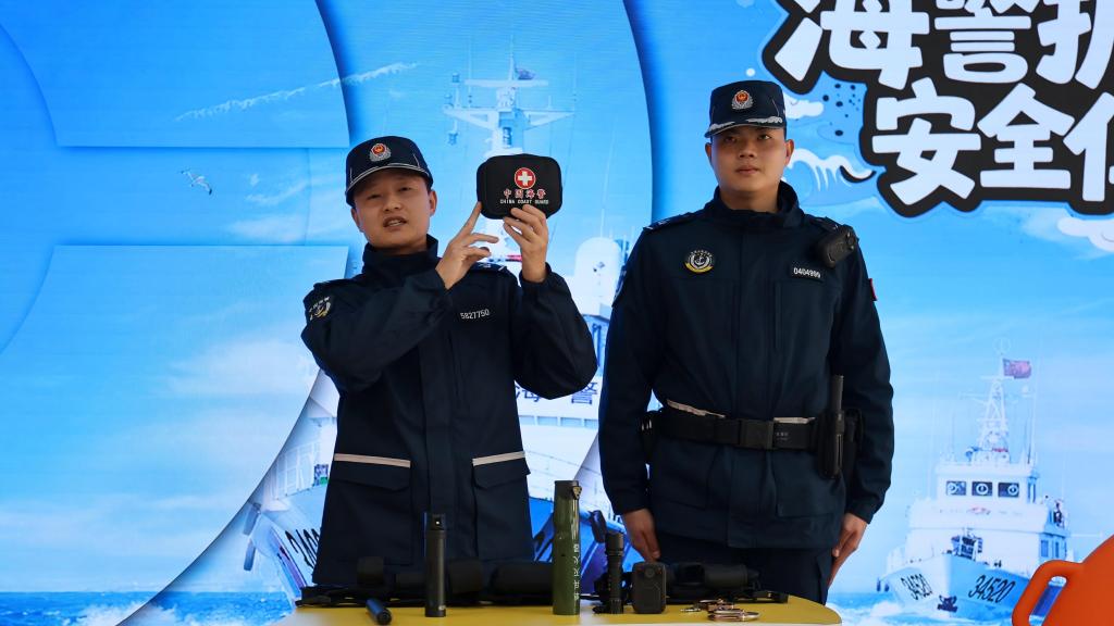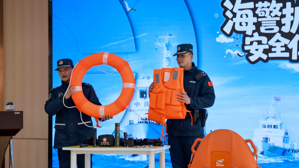 讲台之上,警用与救生装备整齐陈列。执法员逐一讲解装备功能与操作要点,并邀请学生们近距离观察,以直观可感的方式展现海警装备,拉近学生与法治宣传、海上安全教育的距离。