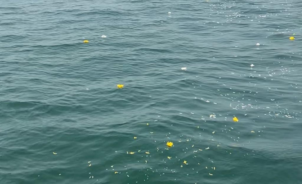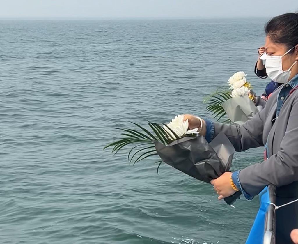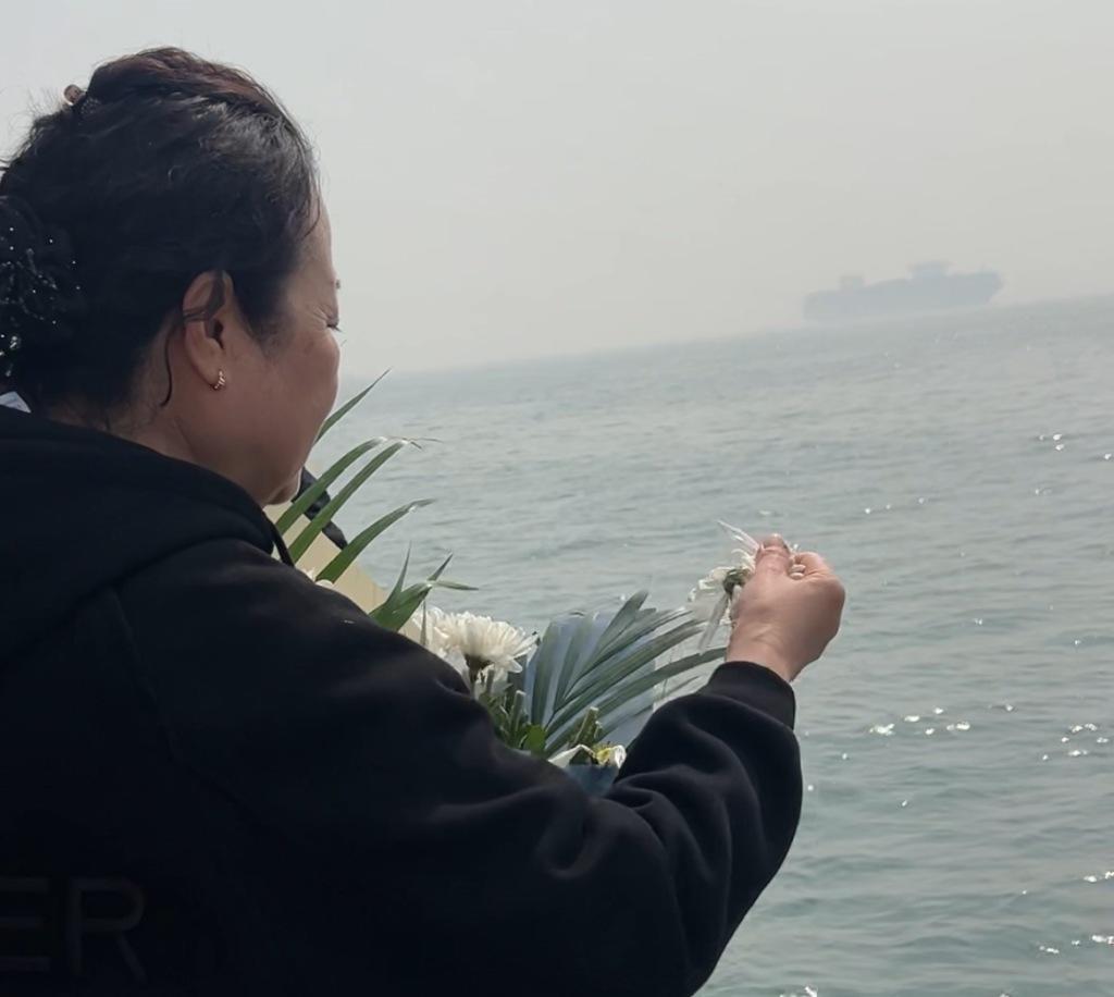 船行至指定海域,鸣笛声响起,海上追思正式开始。家属们三三两两走到船舷边,将手中的鲜花瓣轻轻撒向大海。白色的、黄色的花瓣和祭奠用的粮食在海面上漂浮,随着波浪散开、远去,像一封封寄往深海的信笺。有人站在船边久久凝望,任由海风吹乱头发;有人低声呢喃,像在跟海中的亲人说着悄悄话。