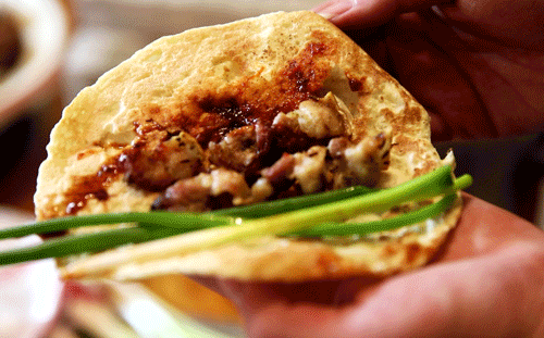 淄博这边,“烧饼”就能分出两路风格。周村烧饼走的是“薄脆派”,薄得像秋叶,上面密密麻麻沾满芝麻,一口下去酥得掉渣,满嘴都是焦香。而淄川肉烧饼走的是“厚实派”,发面包裹着三肥七瘦的肉馅,往铺满芝麻的板子上一蘸,倒贴在炉壁上慢慢“炙”熟。咬一口——酥皮在齿间炸开,芝麻香裹着肉汁在舌尖打滚,配碗小米粥,从胃里暖到心窝。