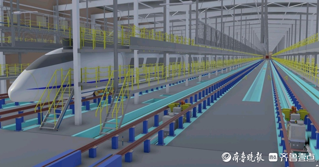 动车运用所是烟台南站改扩建核心配套工程,更是烟台实现从高铁城市“过路站”向半岛区域“枢纽站”跨越的关键所在。目前全省设有动车运用所的城市仅有济南、青岛和临沂,该项目建成后将为山东再添一座高铁动车组大型“体检养护中心”,彻底补齐烟台高铁枢纽发展短板。项目核心工程——六线检查库总建筑面积33044.83平方米,内设6条动车检查库线、30条存车线,另预留检查库线4条、存车线13条,相当于一座可同时容纳数十组动车组列车进行检修作业的巨型“高铁4S店”。库内配备智能检测系统、自动化清洗设备、综合维修平台等先进设施,可实现动车组日常检修、故障排查、车体清洁、部件更换等全流程高效智慧作业,大幅缩短列车周转时间,提升运营效率。