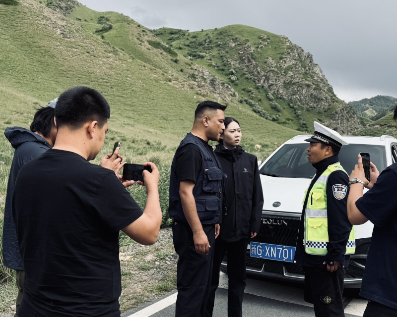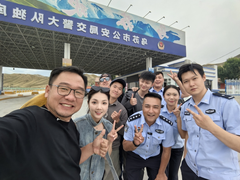 2025年7月,“馕警官”与“大漠叔叔”等媒体同仁齐聚独库公路,携手拍摄警务宣传短视频。乌苏市公安局供图