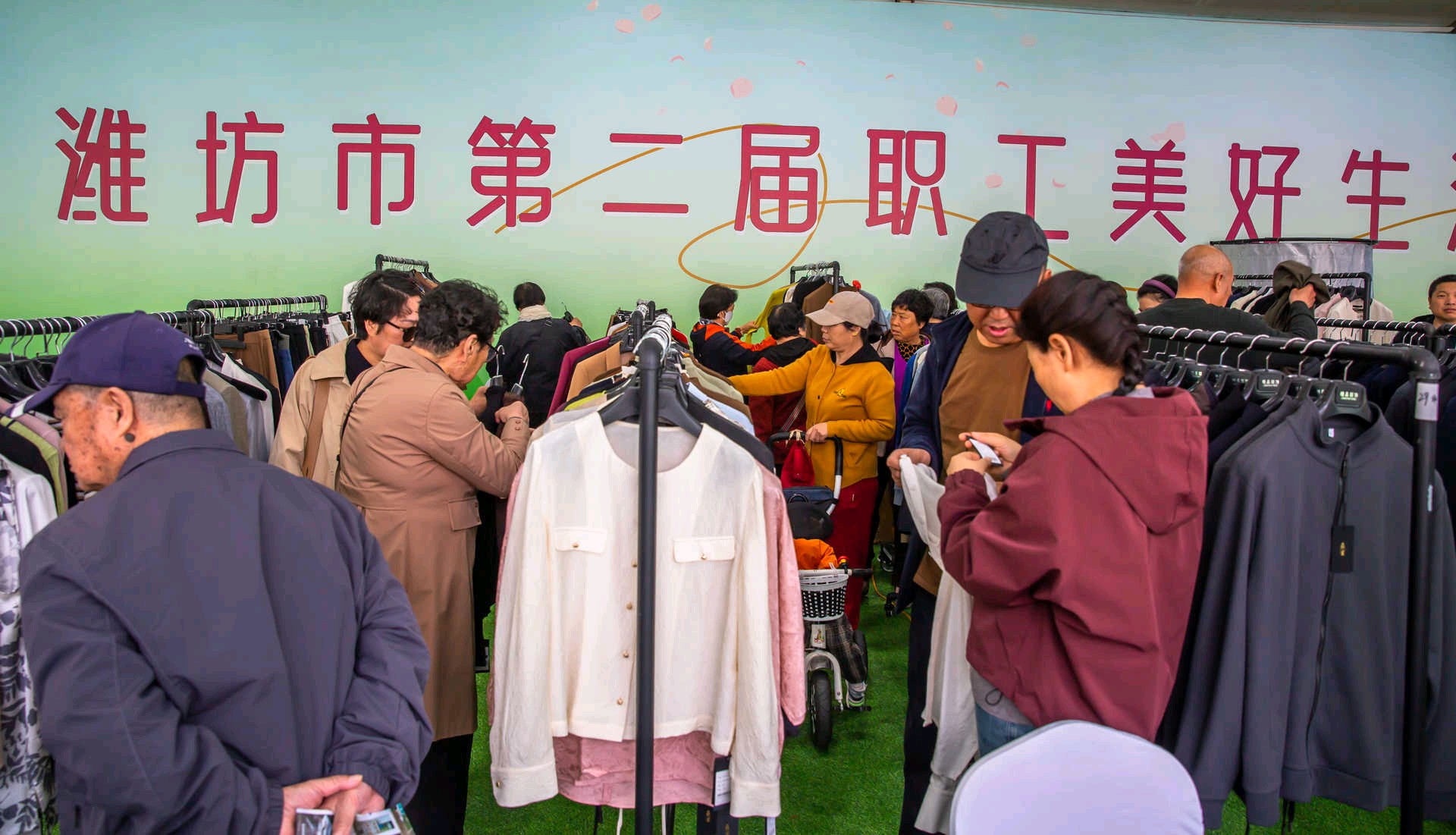 活动现场,亮点纷呈。纺织服装、非遗手造、潍坊好品集中展销,跨境优品、房产汽车、家电好物一应俱全;就业招聘、公益义诊直击职工刚需,时装走秀、文艺演出、特色美食、亲子互动兼顾文化氛围与烟火人气,打造全龄友好、惠工便民的春日消费盛会。