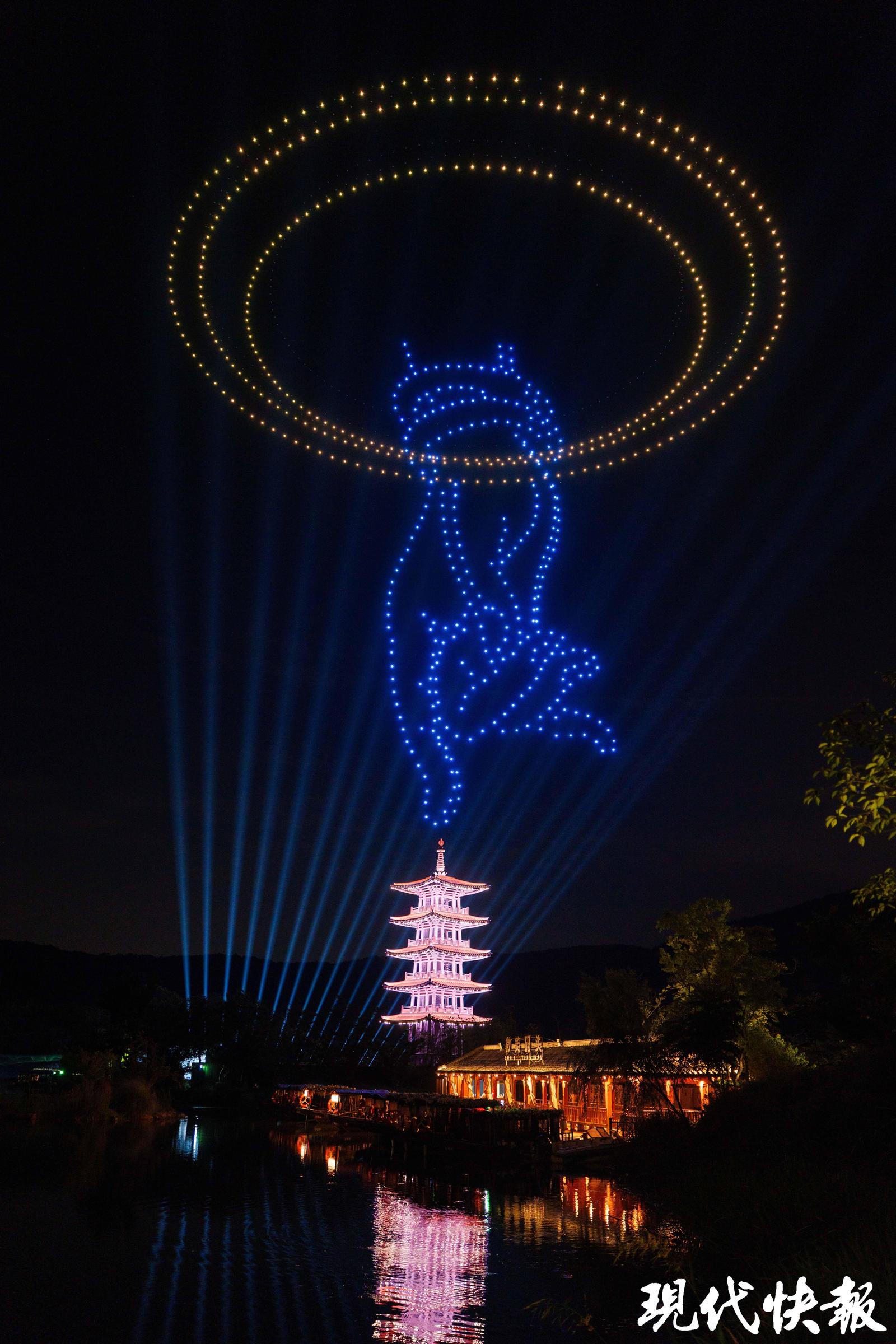 从爆款夜游演艺到国际顶级秀场,拈花湾始终以创新为翼,推动传统文化的现代表达。在文旅与科技的深度融合上,拈花湾持续突破边界,为夜间游览注入全新活力。微笑广场《拈花一笑》演出焕新升级,以天为幕、以光为笔,呈现震撼视听盛宴:夜空中,2000 架无人机编队灵动变幻,时而化作徐徐绽放的莲花,与地面光影交织成诗;威亚演员脚踏发光一叶菩提凌空起舞,飘逸若仙;当 “拈花一指” 轻触 AI 塔尖,银色焰火如星河倾泻,点亮禅意夜空。