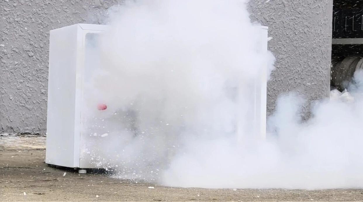 随后,消防员再次用冰箱做测试,将装有干冰和水的矿泉水瓶放入冰箱一段时间后,冰箱门也被巨大的冲击力顶开。