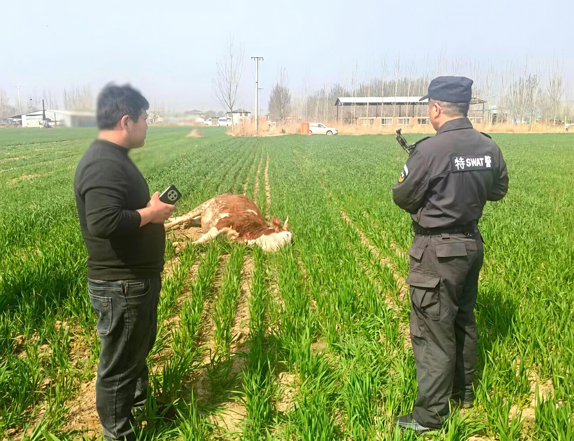接警后,派出所立即启动突发事件应急处置预案,同步联动特巡警大队赶赴现场。抵达后,民警看到疯牛在田间横冲直撞,泥土飞溅、麦苗成片倒伏,周边群众惊慌避让,险情一触即发。