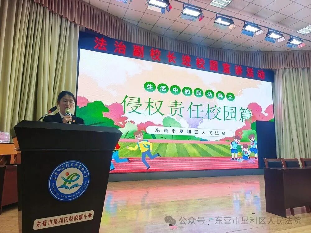 近日,受东营市垦利区郝家镇中学的邀请,东营市垦利区人民法院干警走进校园,为该校学生带来一堂生动的法治课。
