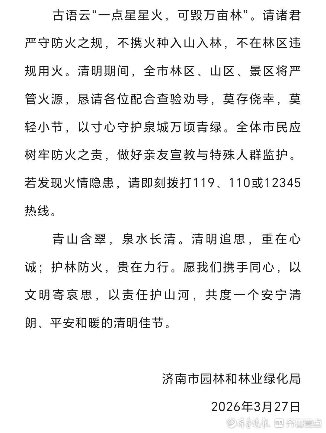 古语云“一点星星火,可毁万亩林”。请诸君严守防火之规,不携火种入山入林,不在林区违规用火。清明期间,全市林区、山区、景区将严管火源,恳请各位配合查验劝导,莫存侥幸,莫轻小节,以寸心守护泉城万顷青绿。全体市民应树牢防火之责,做好亲友宣教与特殊人群监护。若发现火情隐患,请即刻拨打119、110或12345热线。