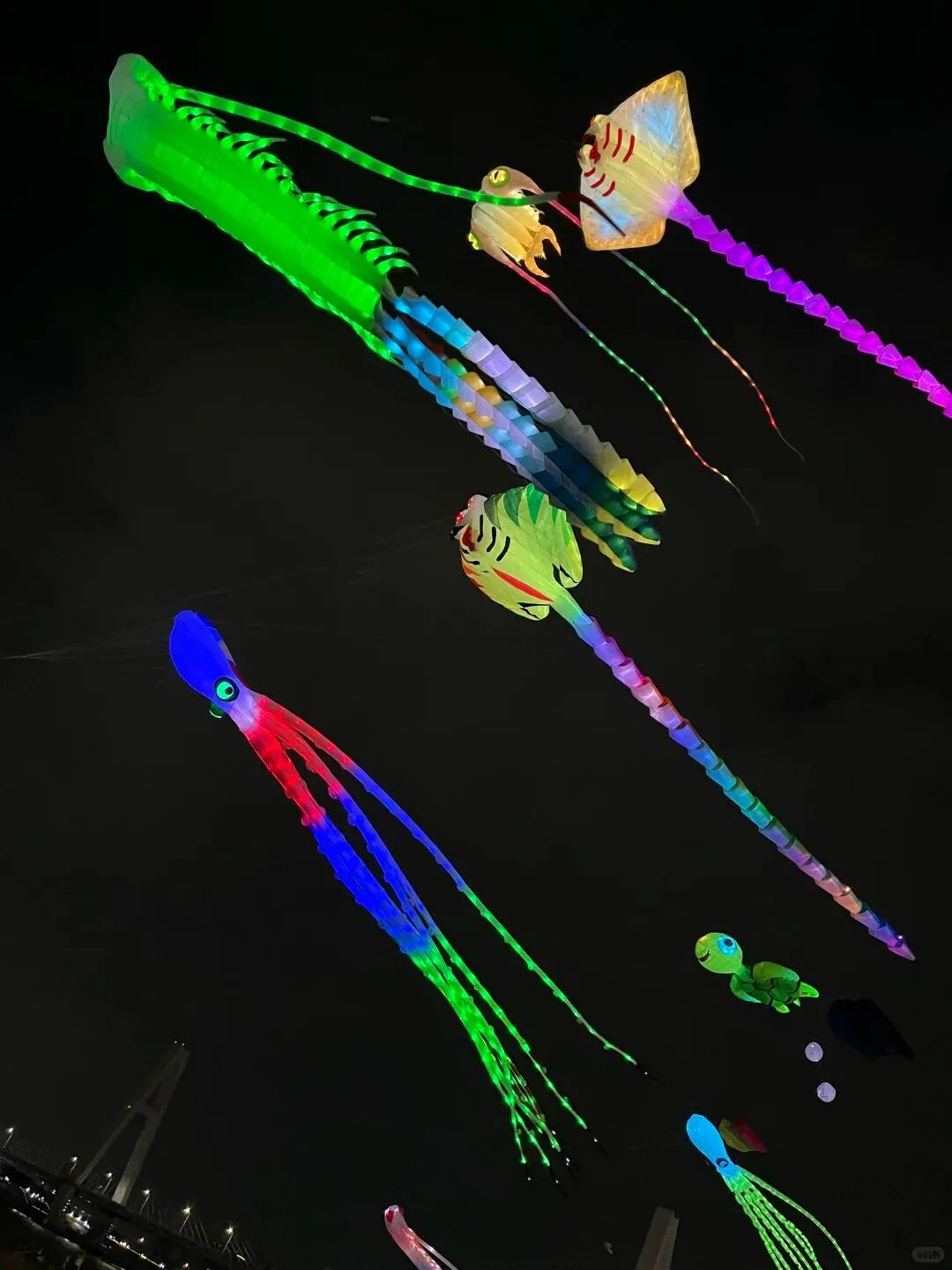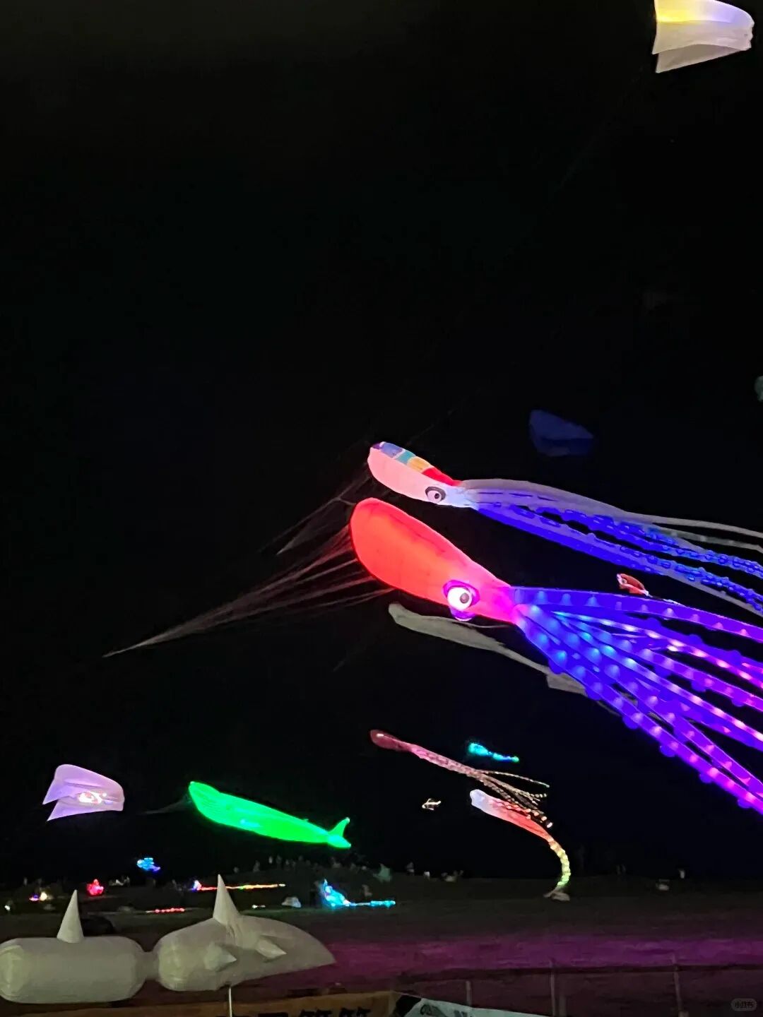 传统纸鸢+现代光影科技,会碰撞出什么火花?LED发光风筝了解一下!当夜幕降临,风筝化作星星点点的光,像是把星河拽到了人间。我们还专门开辟了“夜间安全放飞区”,让你白天放不够,晚上接着玩!这浪漫,谁懂啊?