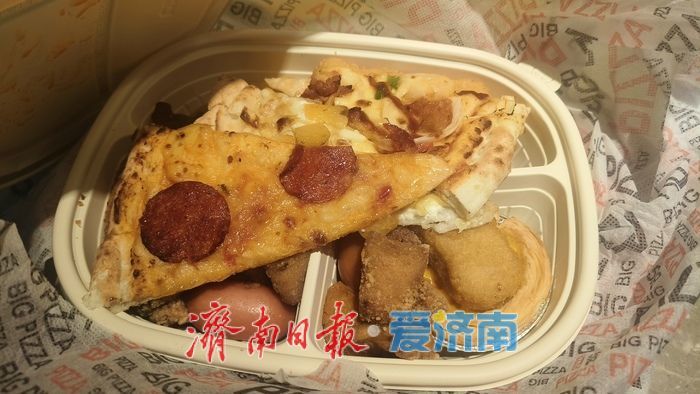 记者在“惜食魔法袋”APP上看到,系统会根据定位推荐附近合作商家。在济南,入驻的商家以烘焙店、便利店和自助餐厅为主,盲盒价格大多在9.9元至15.9元之间,约为原价的三到四折。记者购买的另一份自助餐的午餐小食盲盒价格为12.9元,到手是一盒熟食,包含三块披萨以及炸鸡块、炸鱼、肉肠、蛋挞等小吃,分量远超预期。