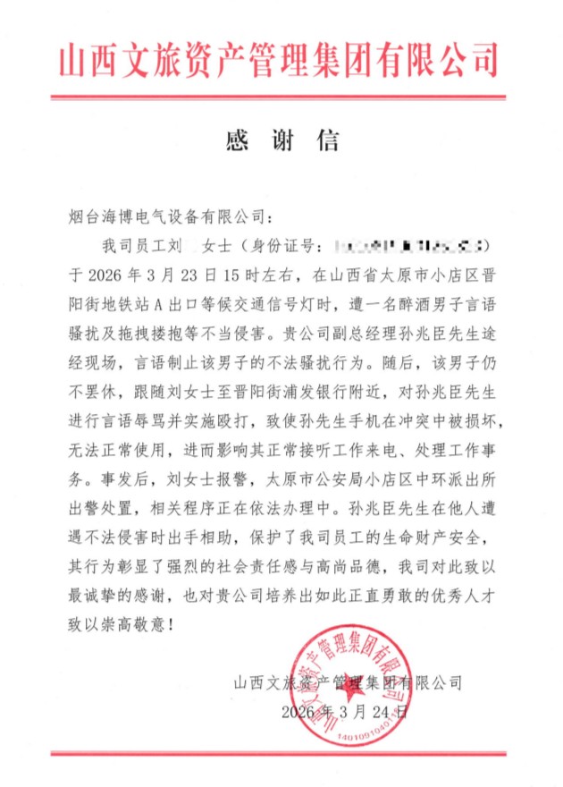 一封跨越千里的感谢信,牵出一段见义勇为的故事。从烟台高新区获悉,近日,山西文旅资产管理集团有限公司专程致信烟台高新区企业——烟台海博电气设备有限公司,对该企业副总经理孙兆臣在太原街头挺身而出、勇斗歹徒的见义勇为义举,致以崇高敬意。