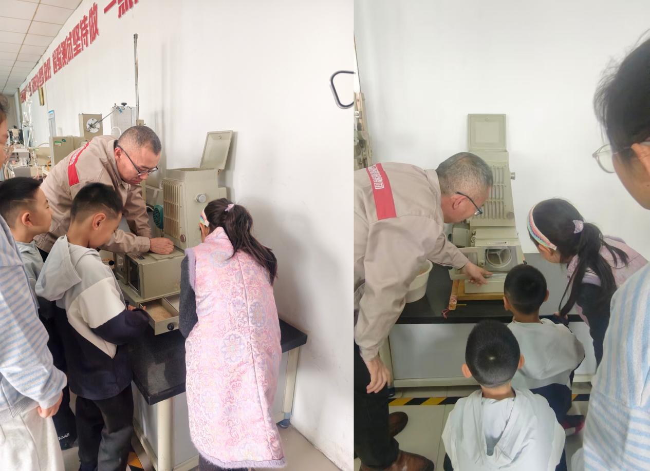 在粮食检验科,孩子们迎来了亲手实操的快乐时刻!孩子们小心翼翼地将小麦铲进研磨机器,短短一分钟,金黄的小麦就变成了细腻洁白的面粉,还分离出了麸皮,神奇的变化让孩子们欢呼雀跃,围着机器看个不停。工作人员还介绍,品品好是山东省唯一配备专业粮食重金属检测设备的粮油企业,每一粒小麦都要经过严格的品质检测、重金属筛查,从源头守住粮油安全,让大家对品品好的产品品质完全放心。