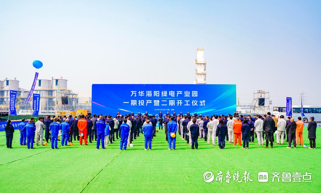 3月28日,烟台海阳市龙山街道,工程车辆整齐列阵,彩旗迎风招展。随着启动装置按下,万华海阳绿电产业园一期项目正式投产,二期项目同步开工。