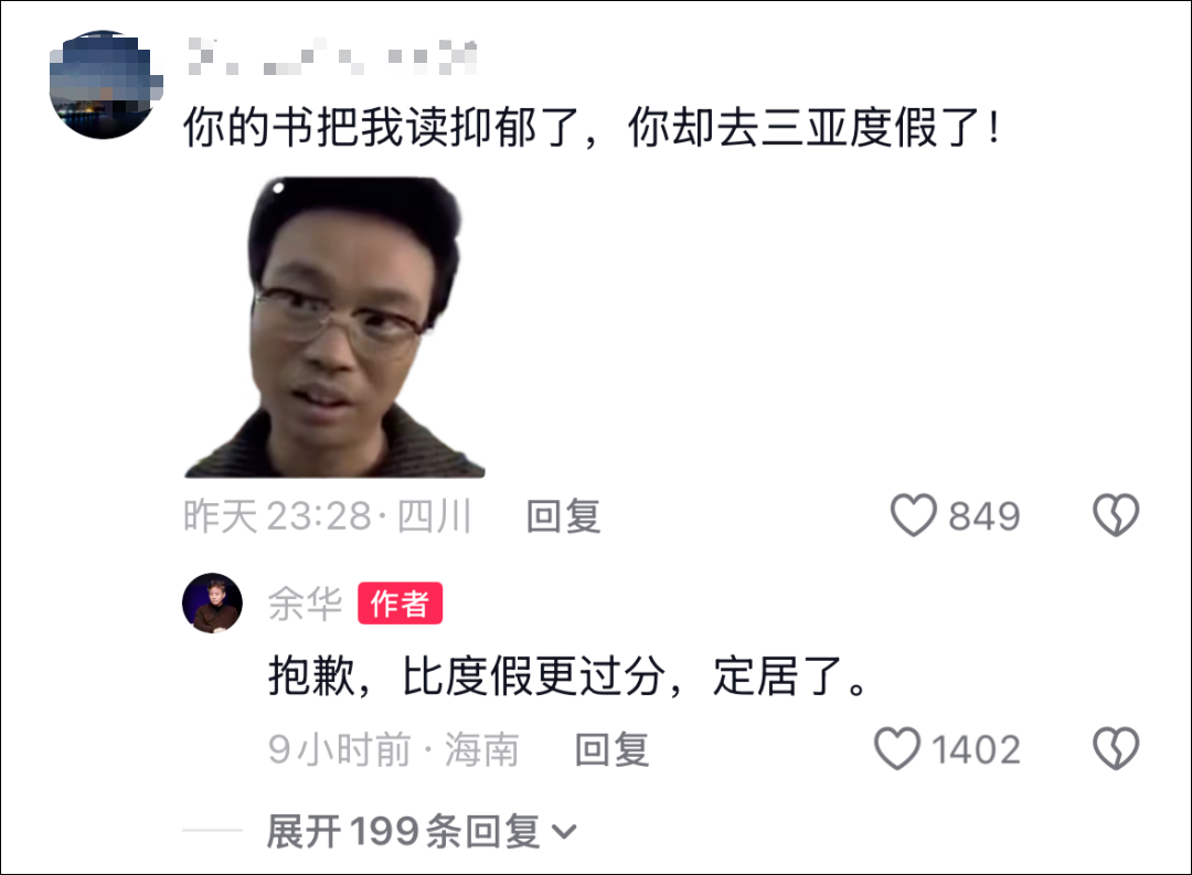 默默大夜猫:三亚挺适合养老的,尤其山里,气候更舒服,余华老师可以好好休养。