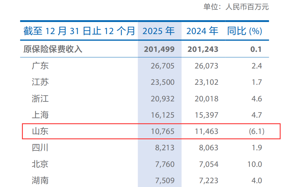 年报披露,太平洋财险2025年在山东地区的原保险保费收入降至107.65亿元,较2024年同期的114.63亿元减少6.98亿元,同比下降6.1%。该公司山东地区的保费收入排名为全国第五位,是全国前八名中唯一一个保费收入负增长的地区。