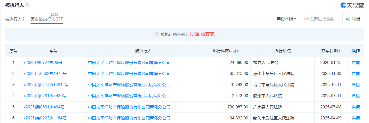 天眼查显示,太平洋财险青岛分公司现存历史被执行人记录多达237条,被执行总金额3158.42万元。
