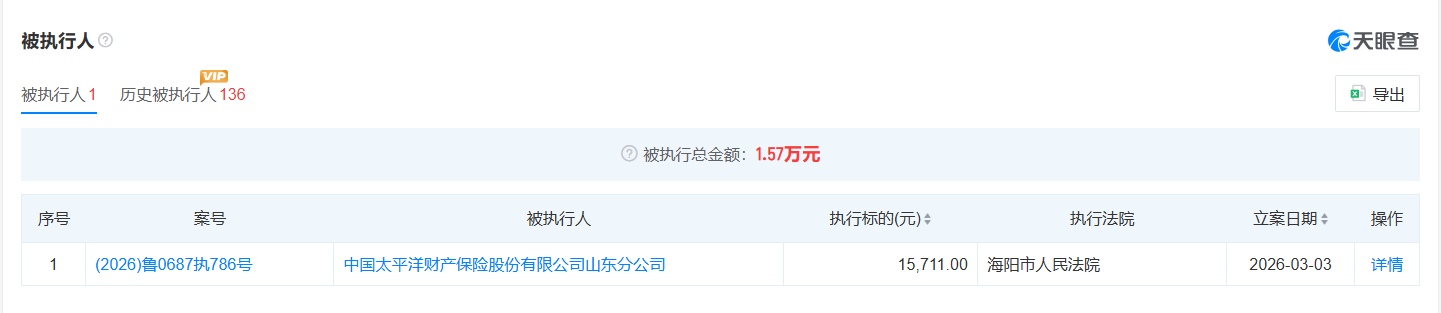 此外,天眼查显示,太平洋财险山东分公司近期被海阳市人民法院列入被执行人名单,执行标的仅1.57万元,立案时间为2026年3月3日。该公司现存历史被执行人记录136条,被执行总金额2689.58万元。