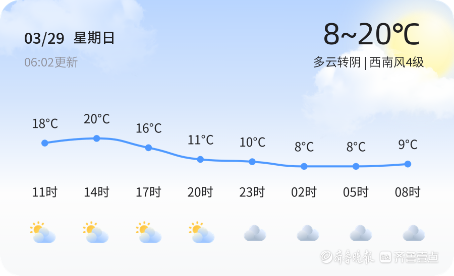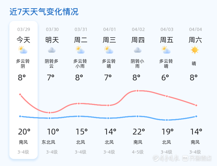 今天是3月29日,星期日,农历二月十一。烟台市今天天气多云转阴,气温在8℃到20℃之间,西南风4级。各区天气总体平稳,多云为主,局部地区有阴天。空气湿度为57%,PM2.5指数为120,空气质量良好。今天的气温适宜出行,市民可以享受春日的温暖阳光。