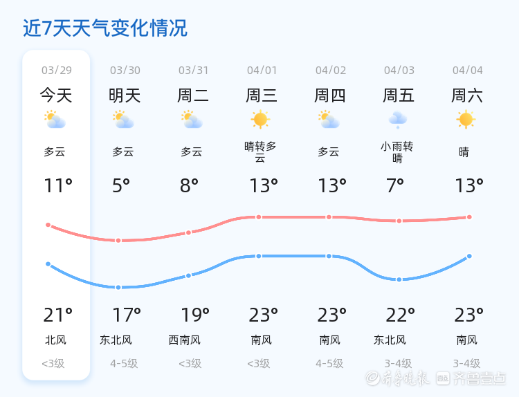 未来三天,聊城市的天气趋势总体平稳,最高气温维持在21℃,最低气温则在5℃至13℃之间波动。预计周六将有一次小雨天气过程,提醒市民提前做好出行准备,携带雨具,注意防雨防滑。