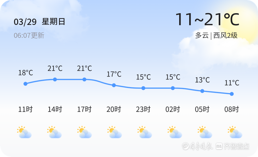 今天是公历3月29日,农历二月十一,星期三。聊城市今日天气以多云为主,气温在11℃至21℃之间波动,西风2级,空气湿度较高,达到93%,PM2.5指数为58,空气质量良好。目前时间为6时7分,实时温度为9.7℃,天气状况较为平稳。