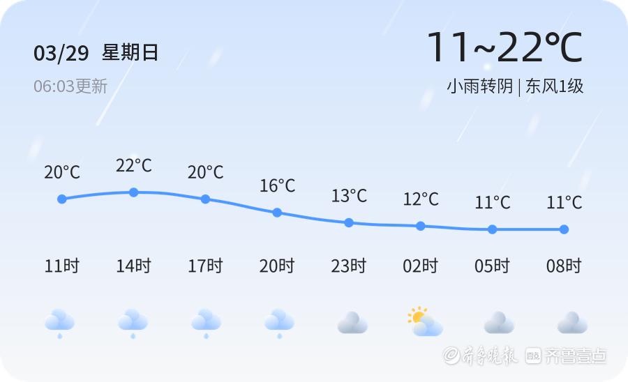 今日是3月29日,星期日,农历二月十一。潍坊市今日天气为小雨转阴,气温介于11℃至22℃之间,东风1级,空气湿度为76%。PM2.5浓度为147,属于中度污染,建议敏感人群减少户外活动。市民出行时请注意携带雨具,驾车时减速慢行,确保行车安全。今天的气温适中,适合户外活动,但需注意防雨和保暖。未来三天,潍坊市天气将以多云和阴天为主,气温逐渐回升,最高温度可达24℃。但市民需注意3月31日可能出现的大风降温天气,建议提前做好防范准备。特别提醒,未来三天内风力较大,外出时请注意安全,避免靠近广告牌等易被风吹动的物体。此外,市民在进行户外活动时,可适当调整衣物,以应对气温的变化。综合未来七天的天气情况,潍坊市气温将呈现波动上升趋势,市民出行时需关注天气预报,合理安排衣着和行程,确保舒适和安全。