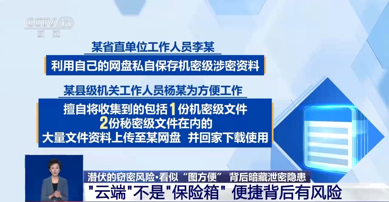 近年来,国家保密行政管理部门公布了多起违规云存储国家秘密的案例,相关责任人在未经保密审查的情况下,将涉密资料上传至网络,事后均依纪依法受到严肃问责处理。比如,某省直单位工作人员李某,利用自己的网盘私自保存机密级涉密资料。某县级机关工作人员杨某为方便工作,擅自将收集到的包括1份机密级文件、2份秘密级文件在内的大量文件资料上传至某网盘,并回家下载使用。