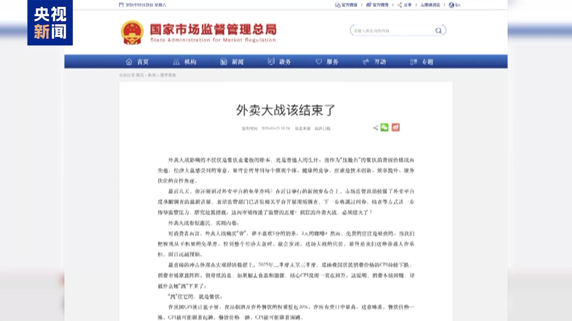 上周,国家市场监督管理总局透露,监管部门已进驻相关平台开展现场调查。本周一,北京市市场监督管理局约谈了包括三大外卖平台在内的12家平台企业。紧接着,国家市场监督管理总局官网刊登媒体文章,明确喊出“外卖大战该结束了”。