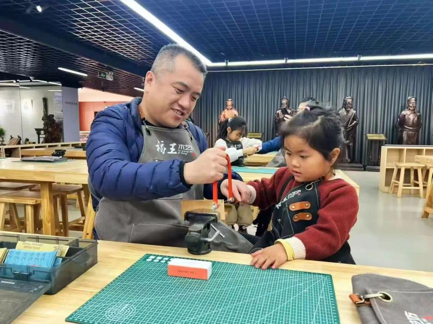 福王木艺坊打造的特色“体验木艺手作,学习工匠精神”系列课程为学生们提供了一个亲自动手实践的机会,让他们在制作木艺作品的过程中,深入学习鲁班精神,培养耐心、专注和创新能力。其中“现代小鲁班”课程作为王牌项目,学生们可以在专业导师指导下化身“小鲁班”,学习传统木工工具的使用,亲手完成测量、锯切、打磨、组装等工序,独立制作一张古朴实用的木凳。