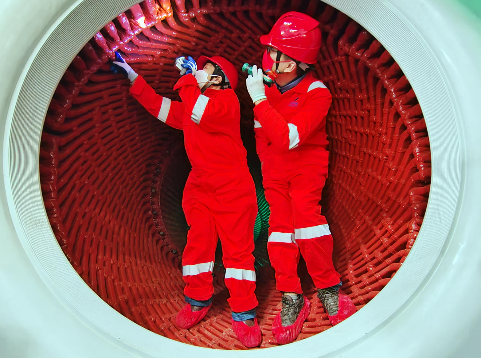 为确保穿装一次成功,项目部联合业主、监理、厂家构建四方协同机制,成立专项小组,多轮研讨、反复优化施工方案,进行桌面推演和现场模拟。穿装前,组织开展逐项进行穿转子前的条件确认,全面清理定子、转子杂物污渍,校验起吊设备,在定子内部铺设滑轨、搭建导向通道对人员进行专项安全技术交底与技能培训,掌握工艺要点,项目部创新采用电动葫芦替代传统手拉葫芦,借助电动设备匀速、精准的控制特性,将作业效率提升40%以上,有效减少人工操作误差。