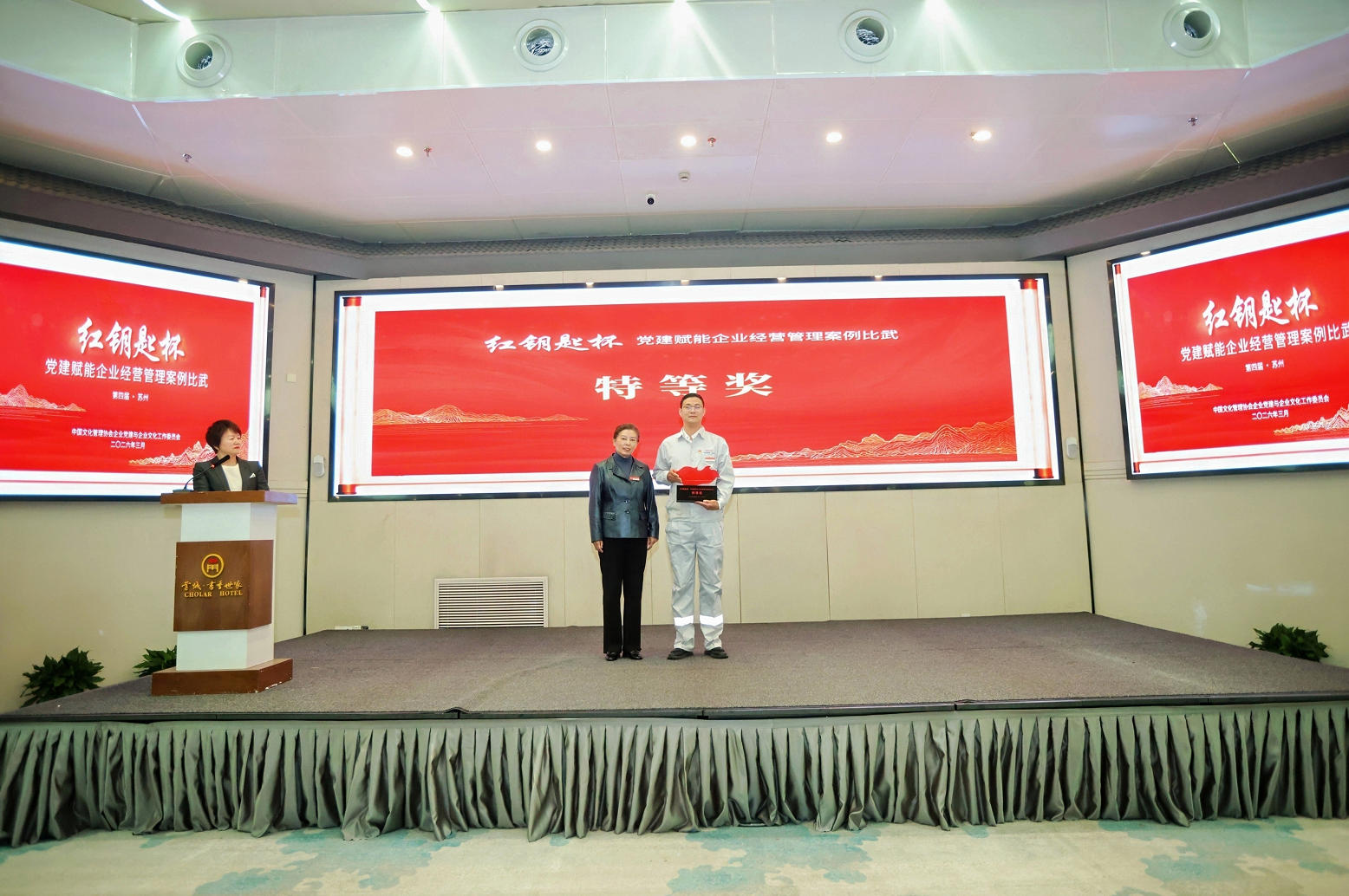 3月25日中午,在现场顺利完成转子穿装、各项工作有序推进后,项目部党支部书记张彬来不及休息、马不停蹄,奔赴另一个“赛场”——第四届“红钥匙杯”党建赋能企业经营管理案例比武现场。3月26日,在苏州的比武现场,他登台汇报展示了支部的党建实践案例,面对世界最大“空气充电宝”建设的“三无”挑战,以“五融五促”这把党建“红钥匙”破解难题,围绕项目高质量履约这一中心工作,将政治、组织、技术、文化、廉政与项目建设全方位融合,发动“红色引擎”,打造“储能先锋”品牌,将党建“软实力”转化为项目履约的“硬指标”,成效和经验显著,得到了现场专家评委的认可和好评,最终该案例脱颖而出斩获特等奖,成为推进党建与生产经营深度融合的生动实践,为公司党建工作再添荣誉。