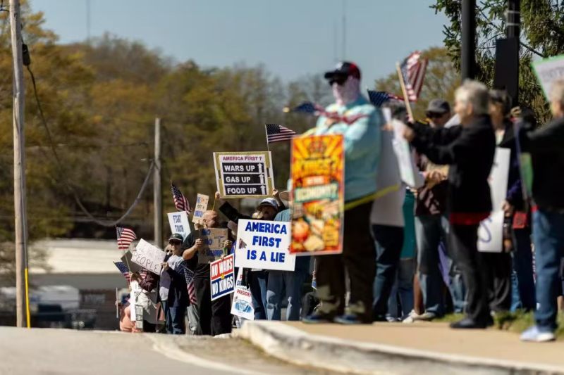 当地时间3月28日,民众在佐治亚州举行反对特朗普抗议集会,抗议者举着写有“美国优先是谎言”“食品价格上涨、天然气价格上涨”等字样的标语牌。
