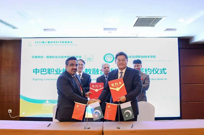 在筑牢办学根基、完善标准体系的基础上,学校加快海外办学网络全域布局,推动职教出海从单点突破向体系化、全域化发展跃升,完成“合作办学-标准输出-出海服务”的第三级跨越。2024年,学校牵头共建中巴数字教育合作平台,启动巴基斯坦-班·墨学院建设;2025年,与巴基斯坦国家职业培训委员会签署的战略合作协议获巴联邦内阁正式批准,取得国家层面权威认可;同年,学校与南非奥贝特公立职业学院共建“国际(南非)职业技能培训基地”,聚焦5G通信、智能机器人应用等前沿领域,为当地5名骨干教师开展了为期两周的专项培训。培训中,南非教师们对中国的职业技能教学方法和实训设备赞不绝口,一位教师表示:“这种‘做中学’的模式非常实用,我们学到的技能可以直接应用到课堂上,帮助更多学生掌握未来工作所需的技术。”