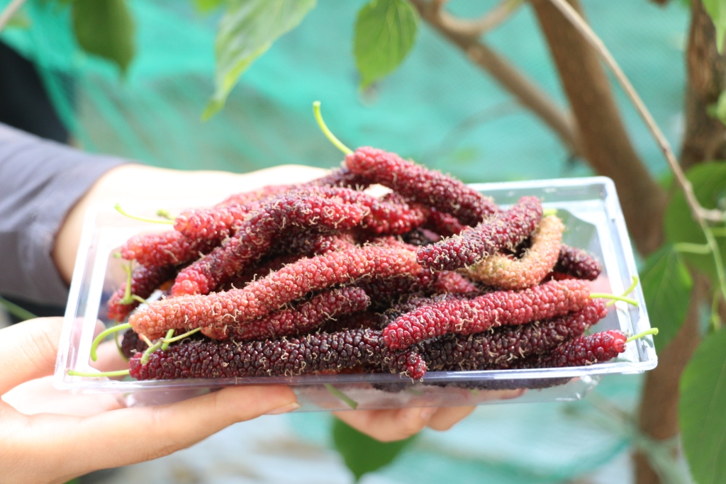 这份甜蜜,给合作社带来了可观的收益。张居克粗略算了一笔账:8个大棚一年的人工成本大约需要10万元左右,加上农膜等耗材,每个大棚的成本在两三万元。而一个大棚的产值在十万元左右,除去成本,纯收入能有八万元左右。游客采摘和上门购买大约各占一半,一箱两斤装的长果桑,如果是游客采摘,价格在100元一斤,如果是批量购买,则按160元一箱结算。