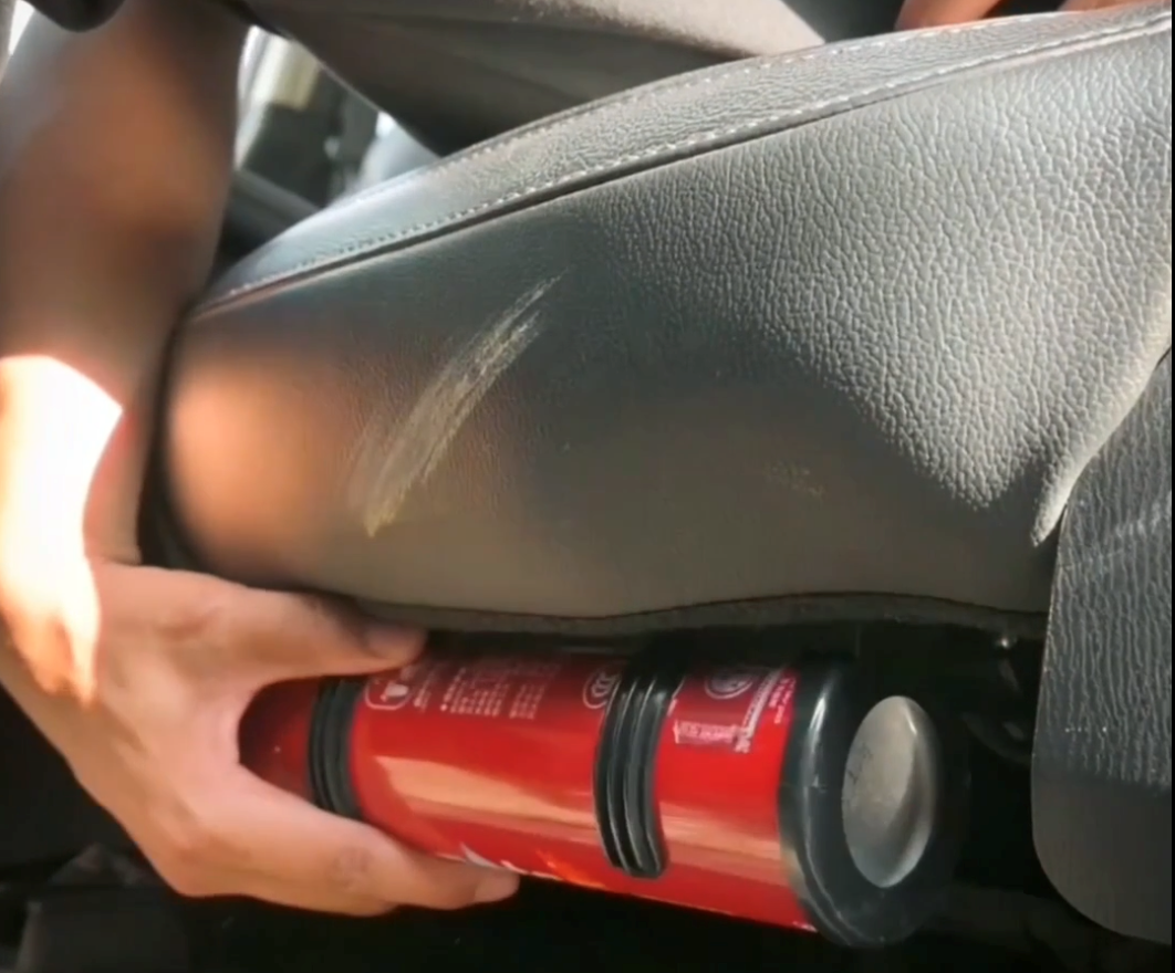 座椅下方:用灭火器固定装置将其固定在座椅底下,可避免行车过程中滚落至刹车、油门处。